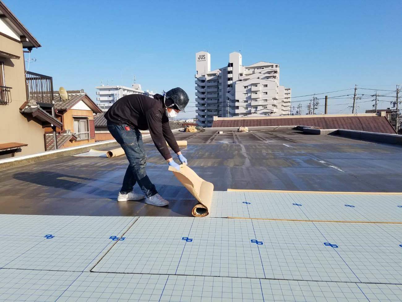 また、通気緩衝シートによって、既存下地のコンクリートに起きる亀裂の発生を抑える事ができますので今回の様な広い箇所に防水工事を行う場合は、こちらの通気緩衝工法で防水工事が適切です。