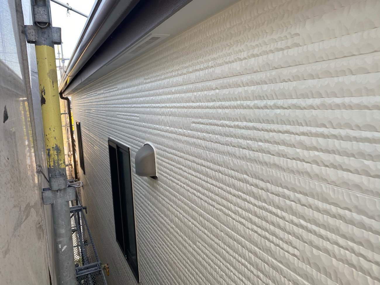 外壁の形状や塗料の種類によっては機械で吹付することもありますが、近隣さんが隣接している事が多い事から、塗料の飛散防止の為にもローラー仕上げが多いですね。
